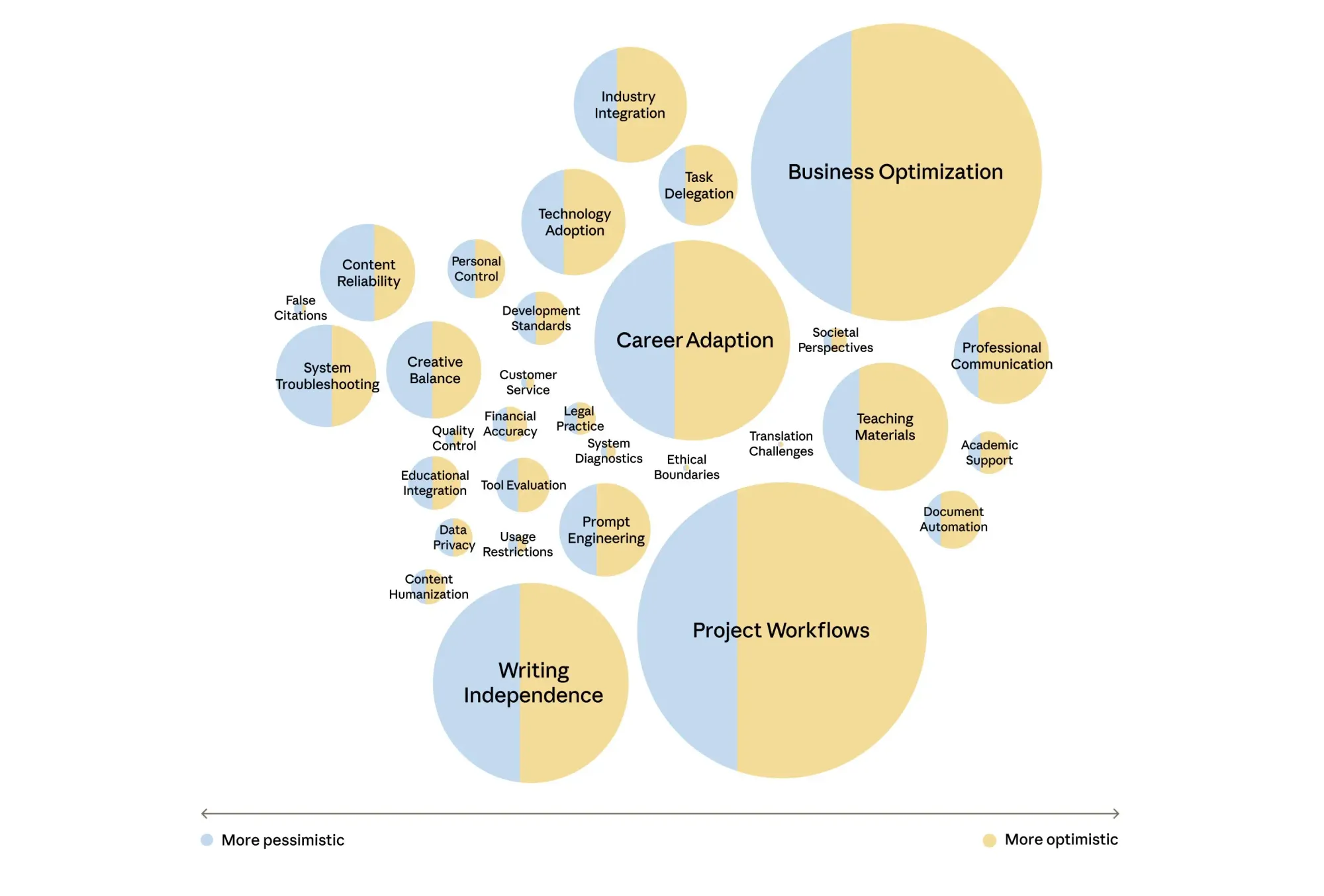 한 커뮤니케이션 전문가는 다음과 같이 말했습니다. "언젠가 제 업무의 대부분이 AI에 의해 대체될 것이라고 믿습니다. 제 역할은 결국 제가 직접 작업을 수행하기보다 모델을 프롬프팅하고, 감독하고, 훈련하고, 품질을 관리하는 쪽으로 집중될 것입니다." 현재 업무에서 AI 사용이 금지된 전문가들(예: 일부 변호사, 회계사, 의료 종사자)은 미래에는 정책 변화로 인해 많은 업무를 자동화할 수 있게 될 것으로 예상했습니다.