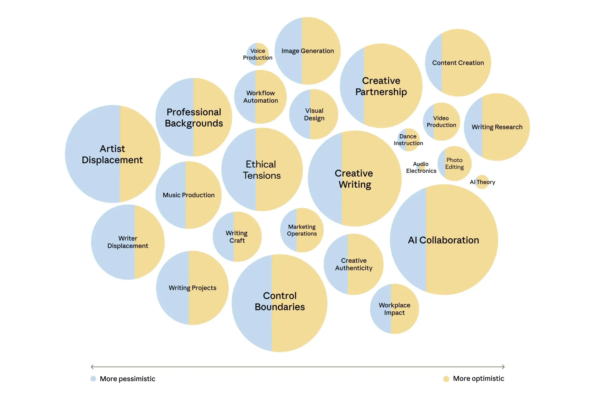 Anthropic Interviewer를 테스트하기 위해, 저희는 전문가 집단—일반 직군(N=1,000), 과학자(N=125), 창작자(N=125)—을 대상으로 AI에 대한 견해를 묻는 1,250건의 인터뷰를 진행했습니다. 저희는 연구자들이 탐구할 수 있도록 이 초기 테스트의 모든 인터뷰 데이터를 (참가자의 동의하에) 공개하며, 아래에 자체 분석 내용을 제공합니다. 요약하자면, 저희가 발견한 몇 가지 예시는 다음과 같습니다: