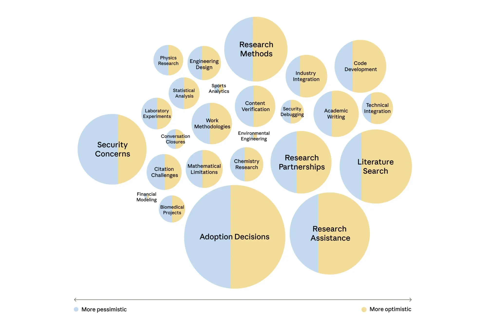과학자들은 일반적으로 AI로 인한 일자리 대체를 두려워하지 않았습니다. 일부는 디지털화하기 어려운 암묵적 지식을 지적했습니다. 한 미생물학자는 "저는 특정 색상에 도달했을 때 다양한 단계를 시작해야 하는 박테리아 균주를 연구했는데, 색상의 차이는 눈으로 봐야 이해할 수 있고 [지침은] 어디에도 거의 적혀 있지 않습니다"라고 설명했습니다. 다른 이들은 연구 의사결정의 본질적으로 인간적인 특성을 강조했습니다. 한 생명공학자는 "실험과 연구는 또한... 본질적으로 저에게 달려 있습니다"라며, "연구 과정의 특정 부분, 예를 들어 실험 실행과 같이 자동화하기 가장 편리한 부분조차 불행히도 AI와 호환되지 않습니다"라고 언급했습니다.