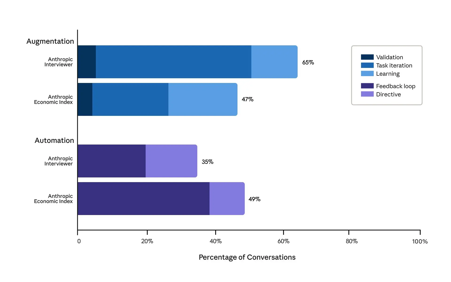이전 분석에서 저희는 AI 사용을 증강(AI가 사용자와 협력하여 작업을 수행) 또는 자동화(AI가 작업을 직접 수행)로 분류했습니다. Anthropic Interviewer 데이터에서 참가자의 65%는 AI의 주된 역할을 증강으로 묘사했고, 35%는 자동화로 묘사했습니다. 이는 Claude 사용 방식에 대한 최신 분석(증강 47%, 자동화 49%로 훨씬 균등하게 나뉨)과 다른 결과입니다. 이러한 차이에는 여러 가지 잠재적 설명이 있습니다: