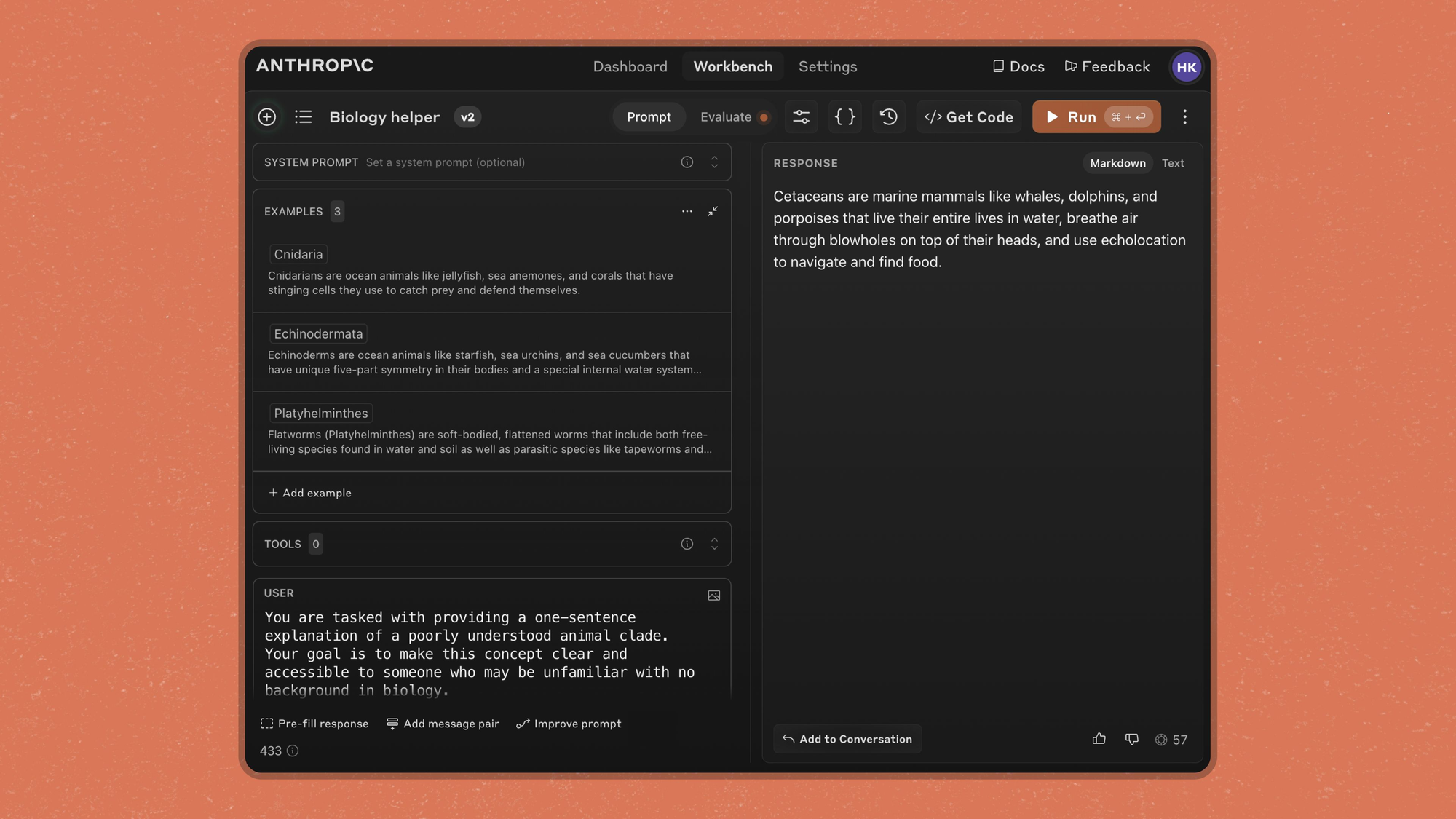 프롬프트에 예시를 추가하는 것은 모델 응답 품질을 개선하는 가장 효과적인 방법 중 하나이며, 특히 Claude가 출력에서 특정 형식을 정확하게 따르도록 할 때 더욱 그렇습니다. 이제 워크벤치에서 직접 구조화된 형식으로 예시를 관리할 수 있습니다. 이를 통해 명확한 입력/출력 쌍으로 새 예시를 추가하거나 기존 예시를 편집하여 응답 품질을 다듬는 것이 더 쉬워집니다.